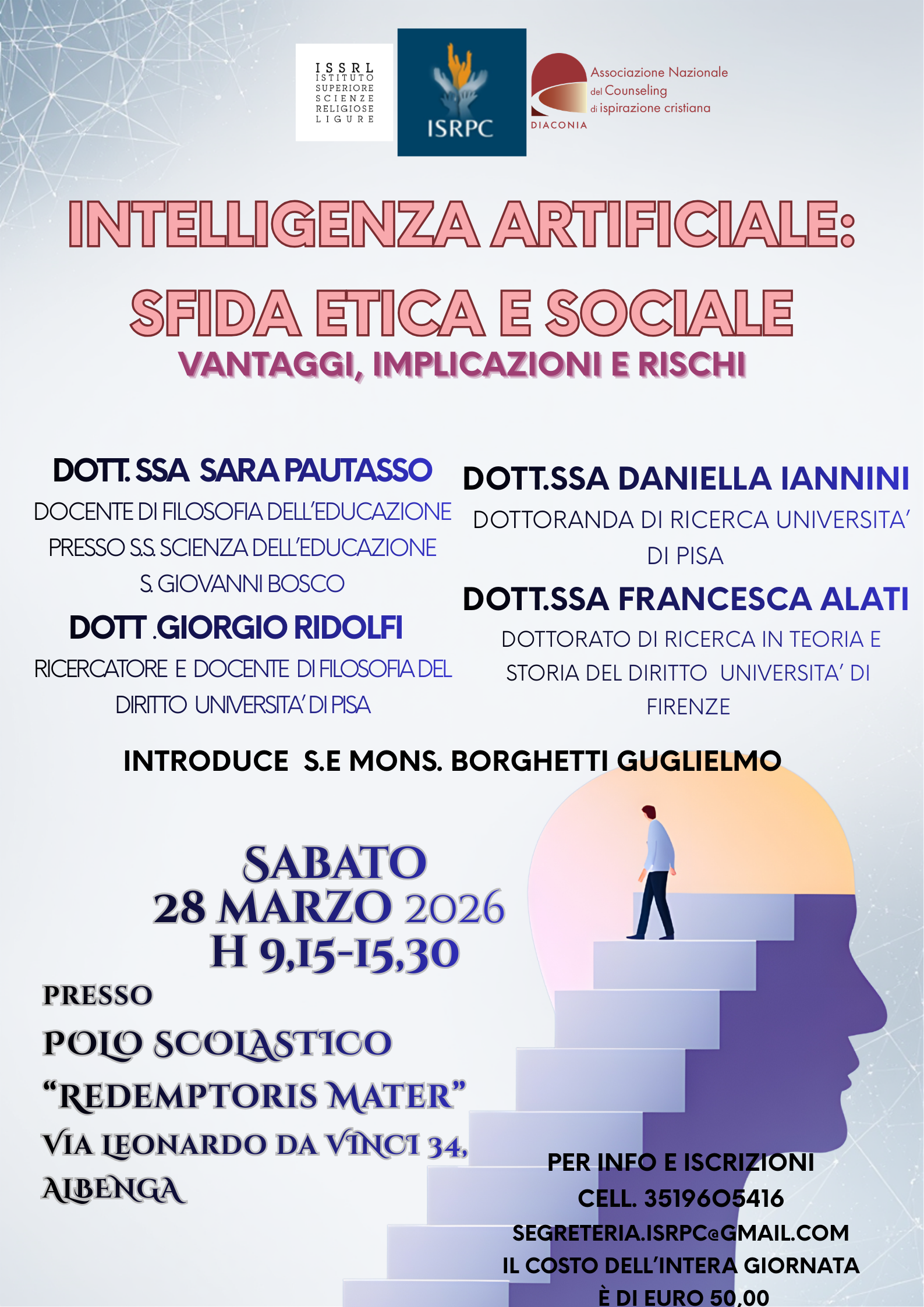 L’ISRPC, in collaborazione con l’Istituto Superiore di Scienze Religiose Ligure e l’Associazione Nazionale del Counseling di Ispirazione Cristiana – Diaconia, organizza una giornata di studio e riflessione sul tema dell’intelligenza artificiale: vantaggi, implicazioni e rischi.